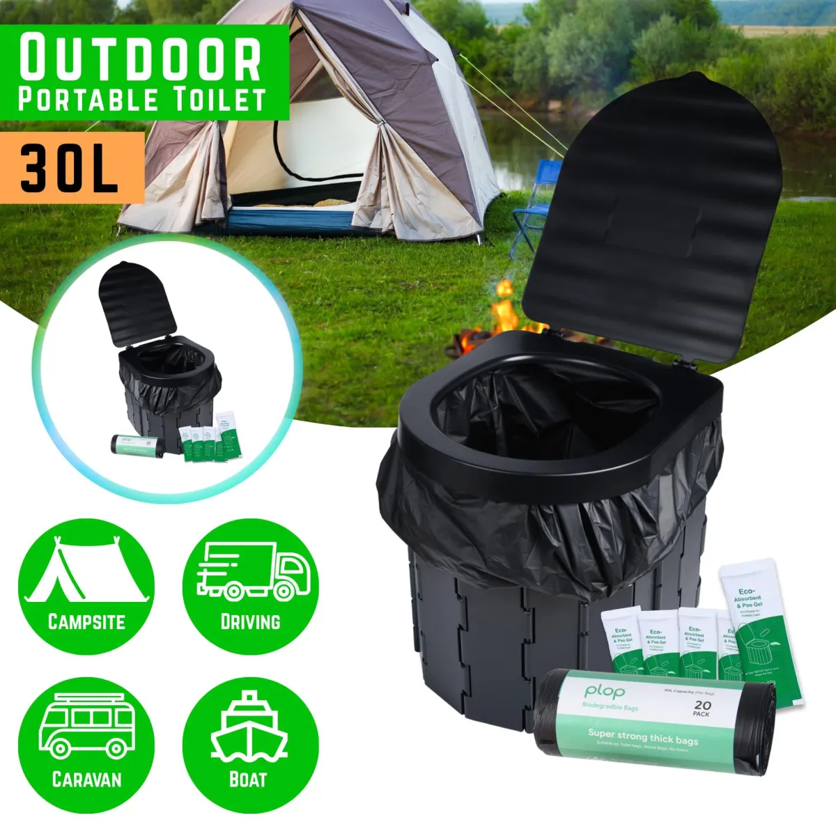 Discover PlopEco®, the next-generation portable camping toilet UK engineered for zero-waste convenience. Designed in Britain, this eco-friendly, chemical-free toilet uses natural eco powder and certified compostable bags to solidify up to 3 litres of waste—no water, no mess, no smell.